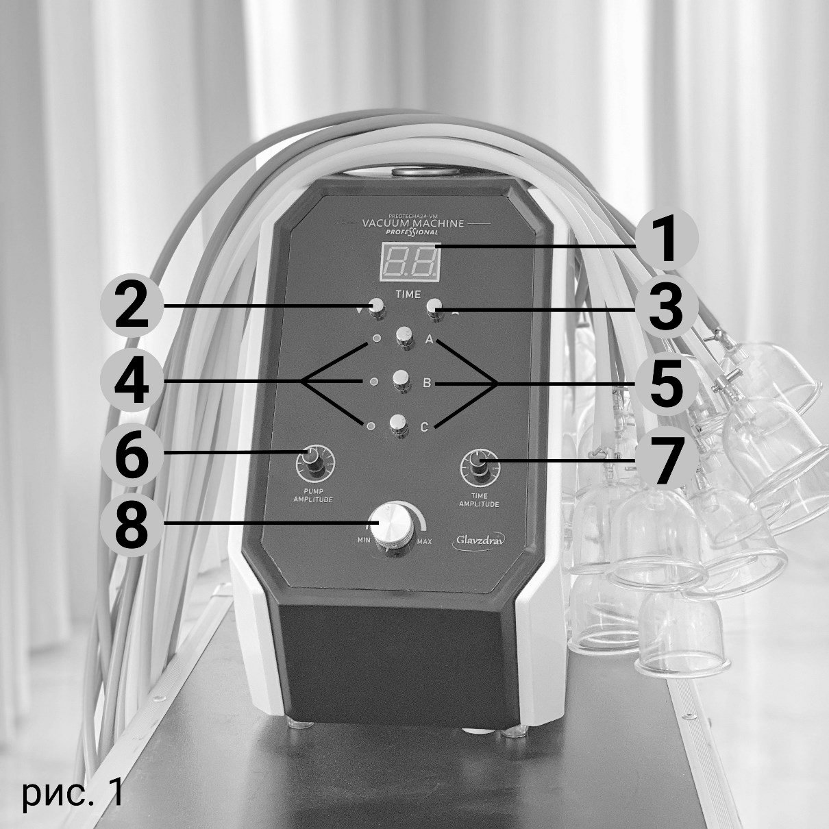 - Нажатием А-В-С, включите требуемый модуль из восьми вакуумных банок. Либо 2 или 3 модуля одновременно, в зависимости от массируемой области.
